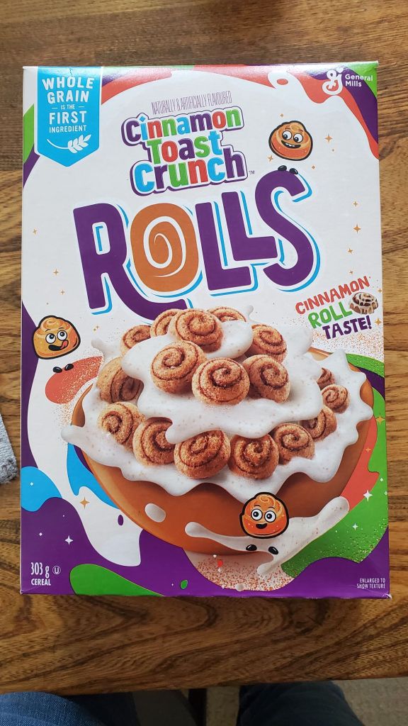 So what cereal did I settle on today after all this? Have to say it was a cathartic experience picking up that box to Cinnamon Toast Crunch Rolls cereal…the advertising on the box claims that ‘whole grain is the first ingredient’ (wait, what?) and that is has a ‘cinnamon roll taste’ as well. Plus, it has these goofy looking mini cinnamon roll emojis amidst the magnificent colour scheme. And any cereal that has ‘brilliant blue FCF’ listed as one of the ingredients, must be a healthy choice. This cereal is the antithesis of Corn Flakes. RIP Corn Flakes.